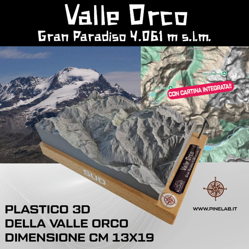 Plastico in 3D della Valle Orco - Gran Paradiso - dimensione cm 13x19 di colore grigio o bianco a scelta. Fornito di cartina e micropicozza.